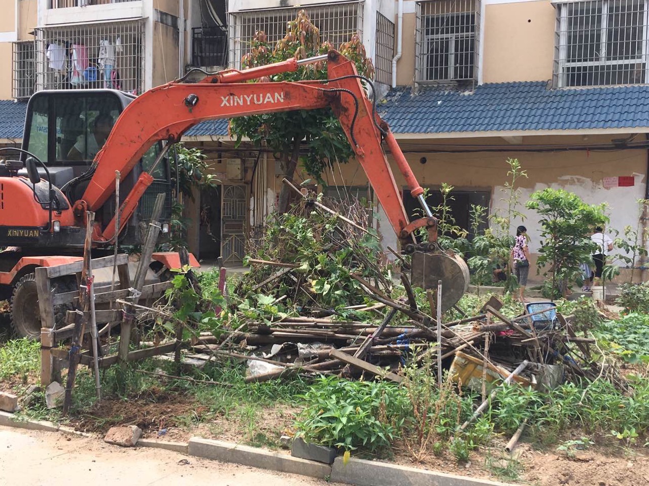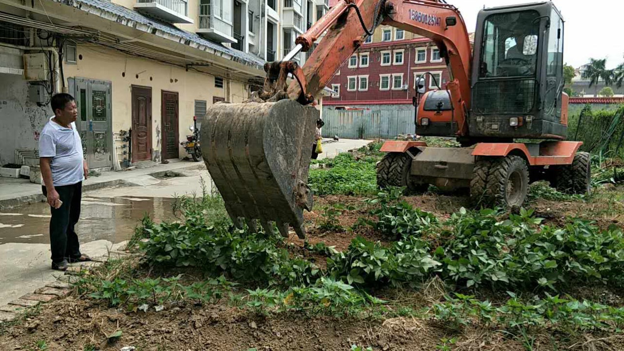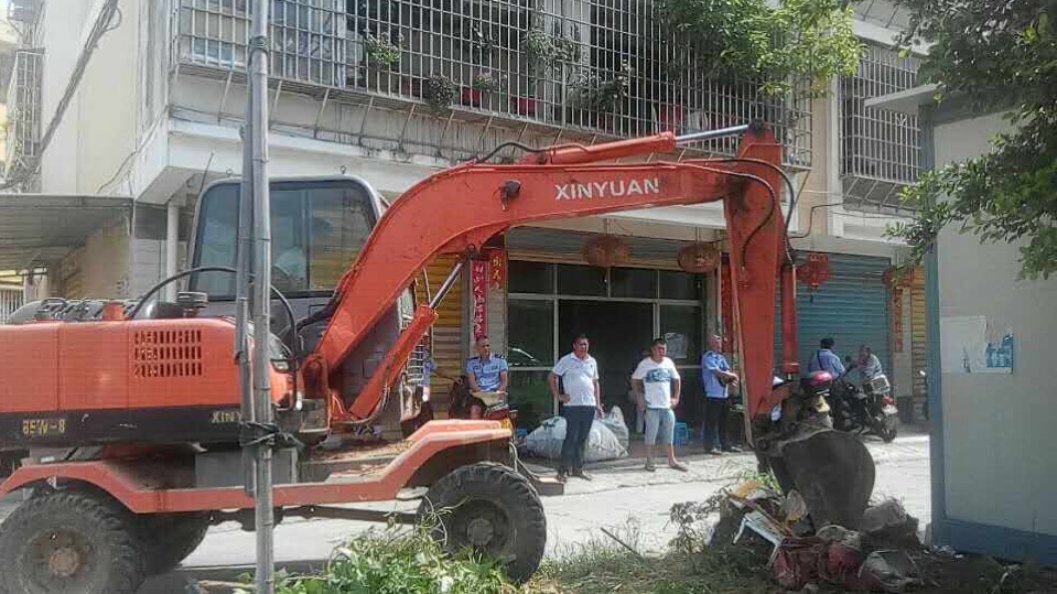 出动大型机械设备,清理脏乱差的卫生死角,对小区内的乱栽乱种,予以全部铲平处理。
