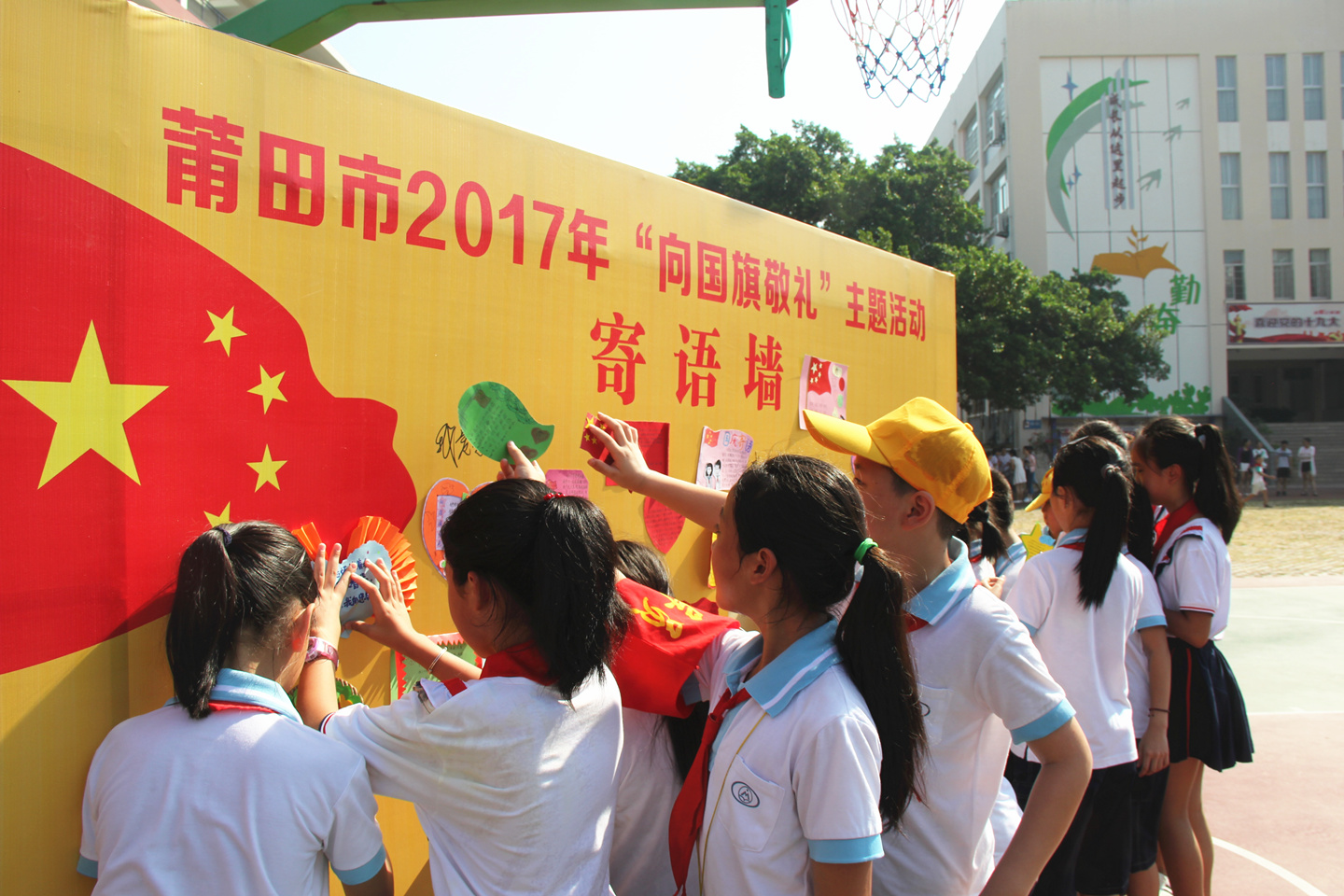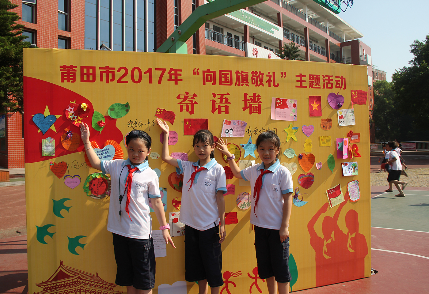 活动中,徐宁馨同学领唱了《歌唱祖国》;蒋璞悦同学代表学校少先队大队部向全校同学发出倡议,要求同学们用实际行动向国旗敬礼。最后,与会嘉宾和师生代表在寄语墙前书写了对祖国母亲的祝福并粘贴了寄语。