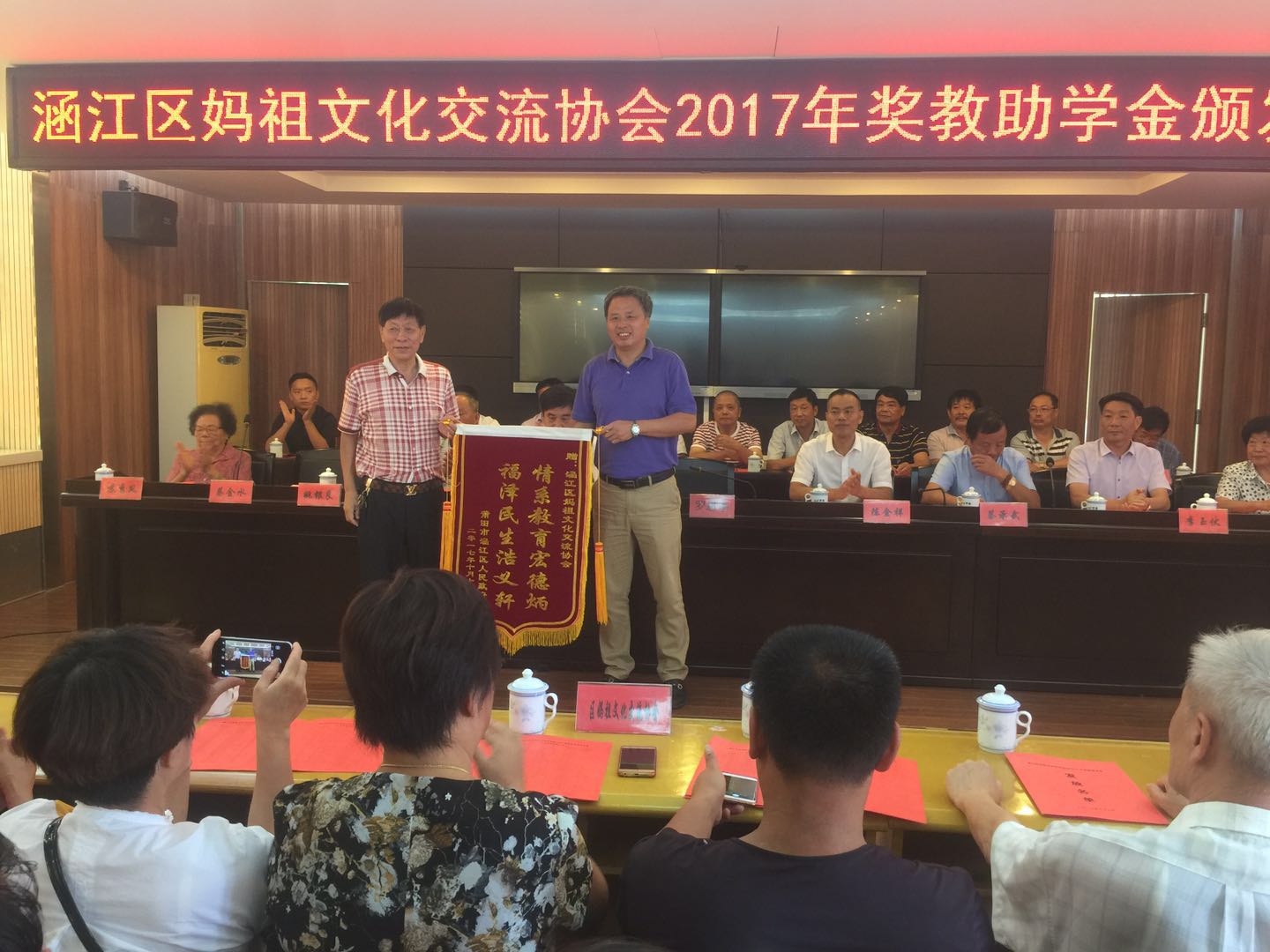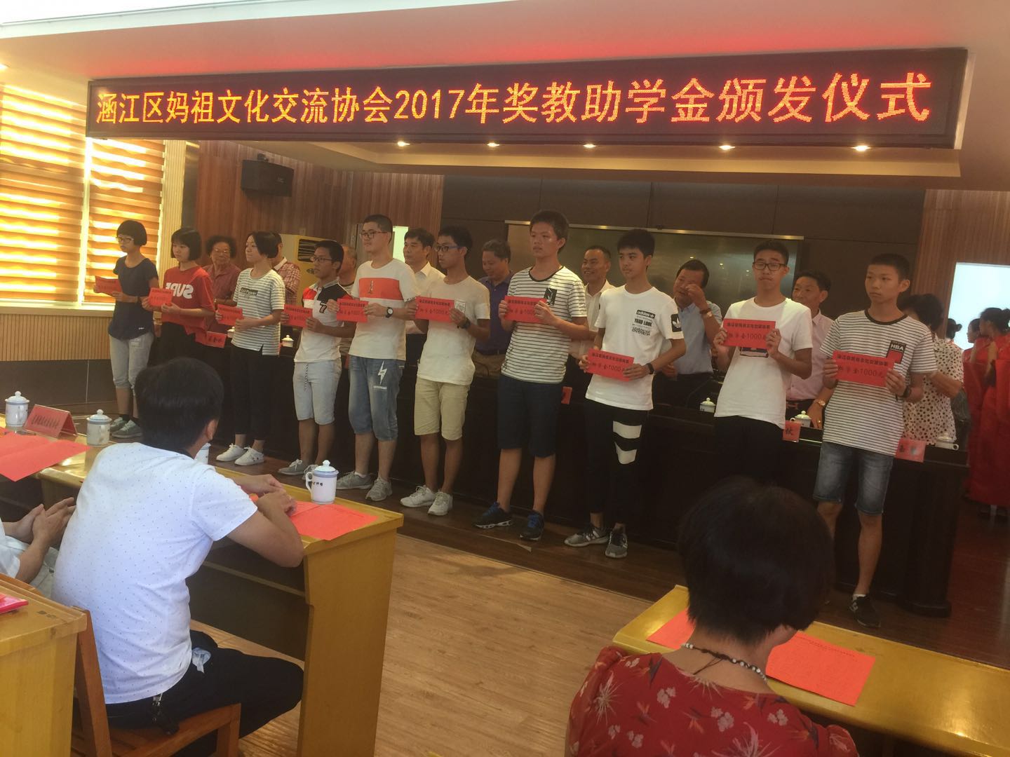 近日,涵江区妈祖文化交流协会2017年奖教助学金颁发仪式在区教育局六楼会议室隆重举行。涵江区委常委、宣传部长罗恩李,副区长陈金祥出席颁奖仪式。