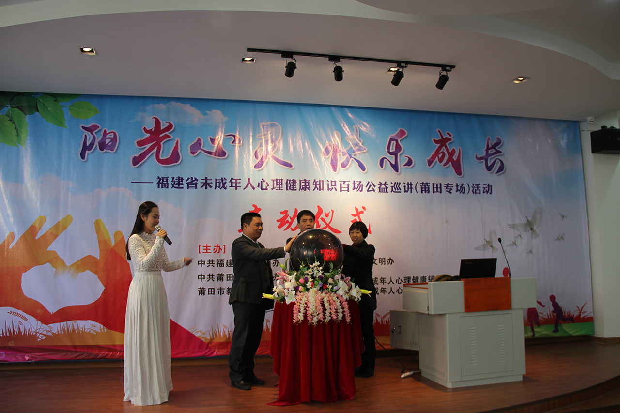启动仪式上,心理辅导老师代表宣读了“关爱未成年人 关注心理健康”倡议书。现场向在全市范围内精心挑选的作为本次未成年人心理健康知识公益巡讲活动的62位授课讲师代表颁发讲师聘用证书。与会领导按下启动球,宣布福建省未成年人心理健康知识百场公益巡讲活动(莆田专场)正式启动。随后,闽南师范大学应用心理研究所所长、教授、硕士生导师陈顺生博士就《孩子·父母·学校——做一个有助益的师长》进行首场专题讲座,丰富的内容、生动的语言让在场近百余观众受益匪浅,赢得阵阵掌声。活动最后,与会领导和观众组织参观了涵江区校外未成年人心理健康辅导站。