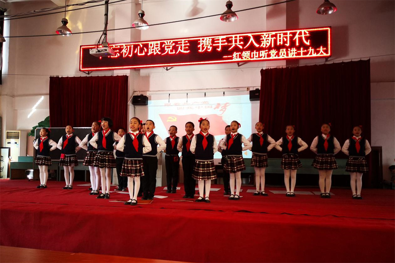 活动在“重温十九大报告”中拉开帷幕。随后,三位党员代表畅谈自己学习十九大的心得体会,表示一定会以习总书记提出的“不忘初心,牢记使命”八个大字始终鞭策自己,为建设老百姓满意的学校而不懈努力。接着,学校校长对少先队员们提出了要求,希望队员们要牢记习近平总书记“从小学习做人、从小学习立志、从小学习创造”的谆谆教导,好好学习,努力成长为对祖国、对人民、对社会有贡献的一代新人。