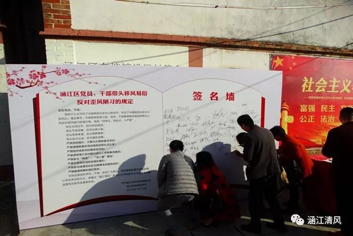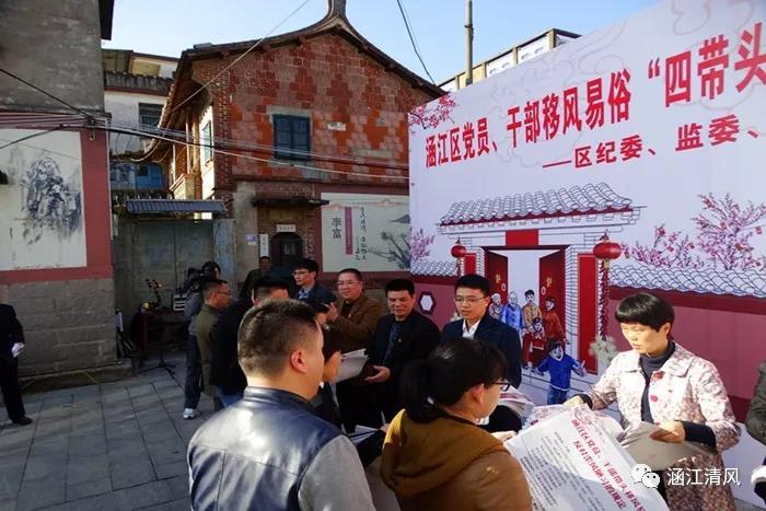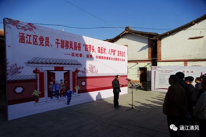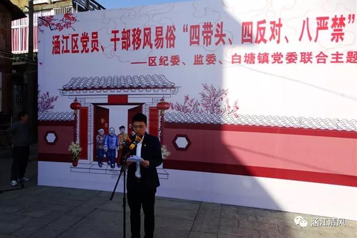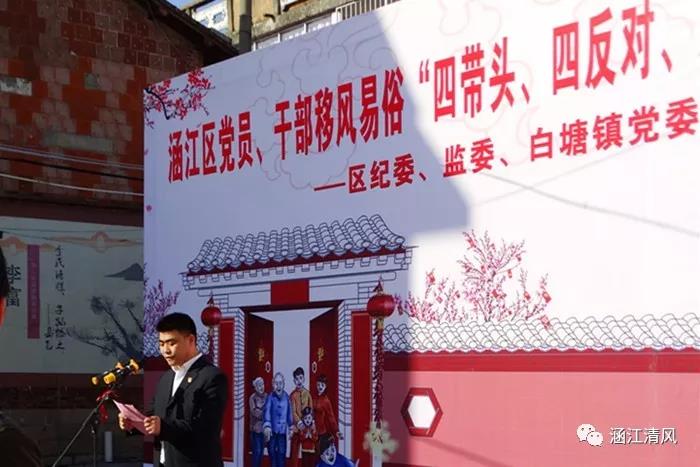 1月16日下午,涵江区纪委、监委在白塘湖公园白塘科第(莆阳姓氏源流馆)举行涵江区党员、干部移风易俗“四带头、四反对、八严禁”发布仪式暨区纪委、监委、白塘镇党委联合党日活动。通过宣读发布《涵江区党员、干部带头移风易俗反对歪风陋习的规定》、农村党支部书记代表作带头执行规定推进移风易俗工作表态发言、乡镇党委代表作落实党委主体责任深入推进移风易俗工作表态发言、分发《涵江区党员、干部带头移风易俗反对歪风陋习的规定》宣传图片、全区纪检监察干部、白塘镇党员干部带头在移风易俗“四带头、四反对、八严禁”图幅上签名等形式,助推全区移风易俗工作深入开展,进一步引导全区党员干部深入弘扬中华民族优秀传统美德,剔除歪风陋习,做移风易俗的带领者、传播者、助推者,做到“四带头、四反对、八严禁”,以“关键少数”带动绝大多数,潜移默化,营造向上向善的新风尚。