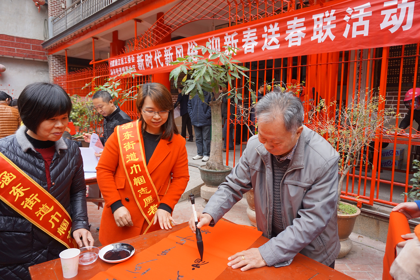 当天,尽管寒潮来袭,但是活动现场热闹非凡,来自民盟的10多位书法家挥毫泼墨,书写内容紧密围绕“倡导移风易俗”的主题,将千余幅喜气丰盈的春联赠与社区居民。