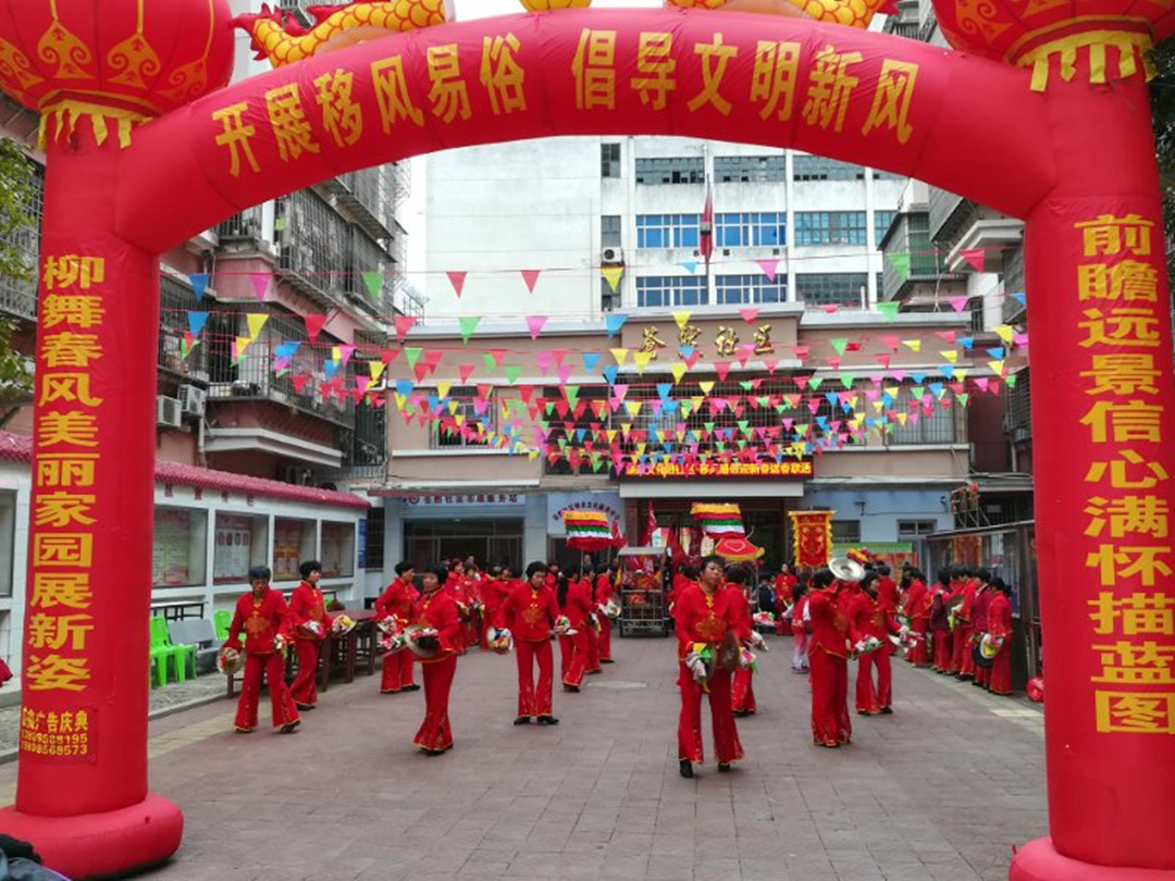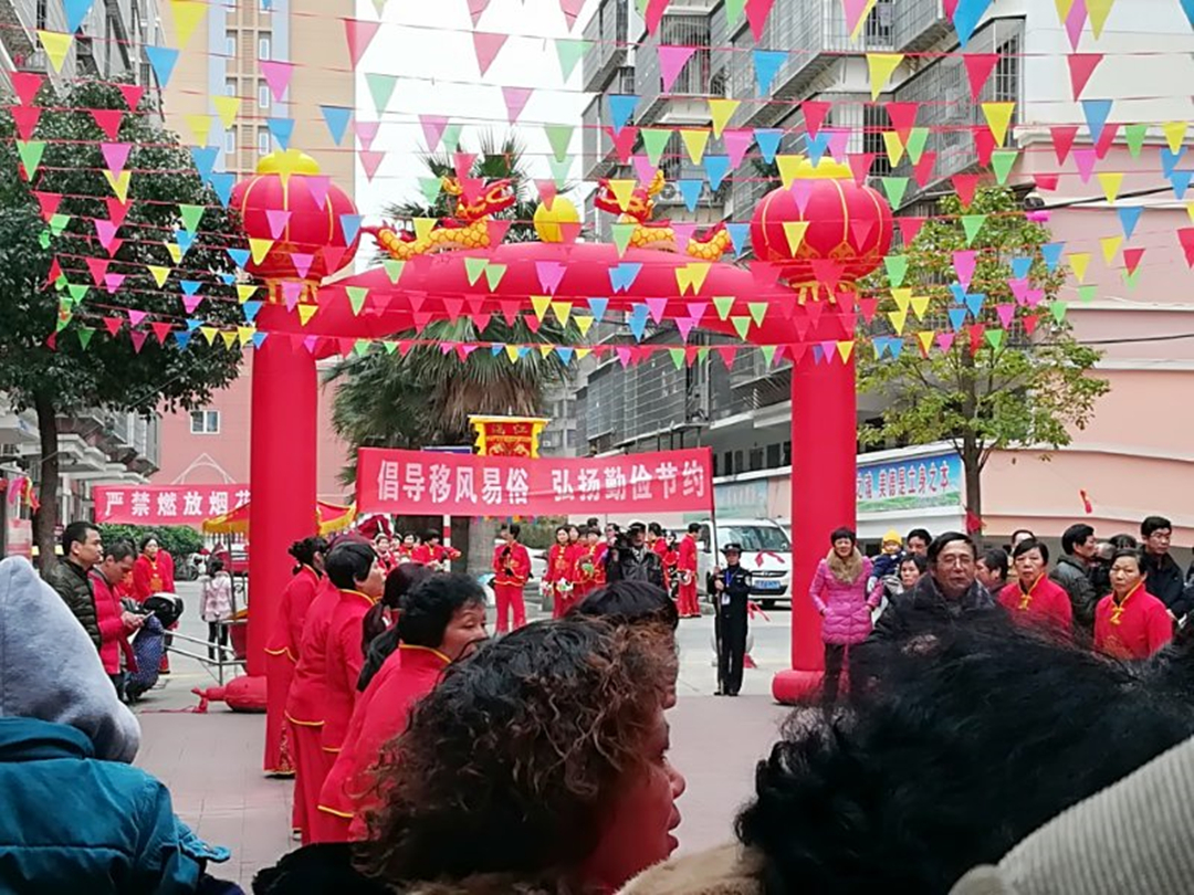 为了增强宣传效果,苍然社区组织了七十多人的车鼓队进行巡居宣传。伴着“咚咚齐咚——圈”“咚咚齐咚咚——圈”的调子,装扮有“倡导移风易俗 弘扬勤俭节约”、“严禁燃放烟花爆竹”等主题横幅的队伍走街串巷,宣传移风易俗新风尚。