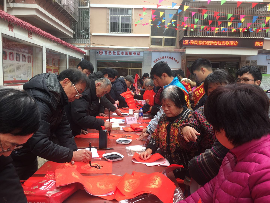 当天,在社区居委会广场上,工作人员利用展板,向居民讲解移风易俗相关内容,并邀请居民们签订移风易俗及禁燃烟花爆竹的承诺书。同时,莆田市老年艺术协会的成员们挥毫泼墨,书写移风易俗春联,赠送给社区居民。活动吸引了众多居民前来参加,现场热闹非凡,洋溢着节日氛围。