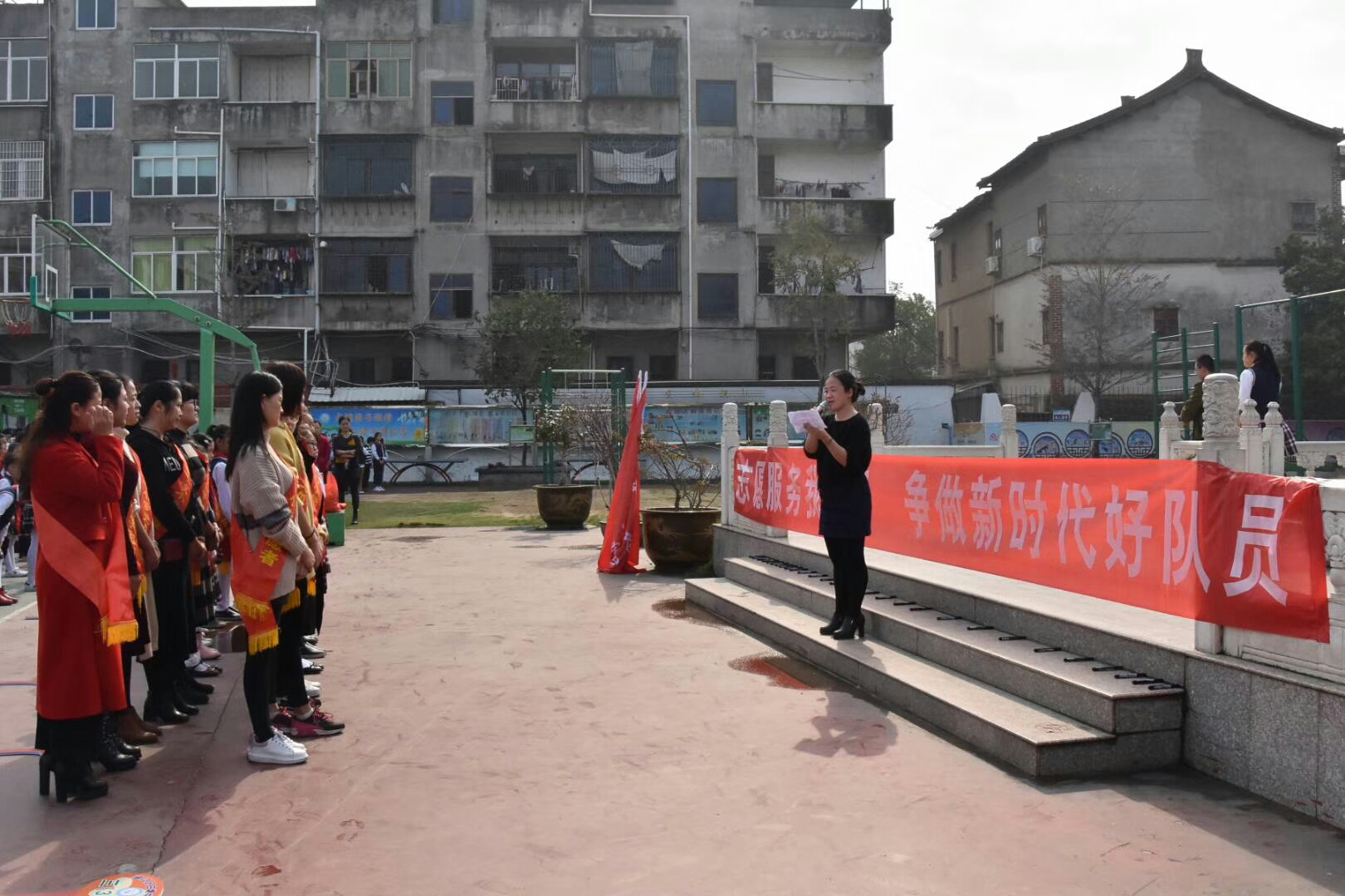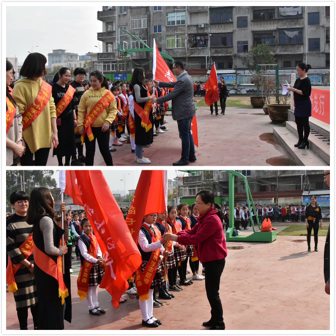 在雄壮激昂的《运动员进行曲》中,陈校长为党员教师志愿者代表授旗,李书记为学生志愿者代表授旗。