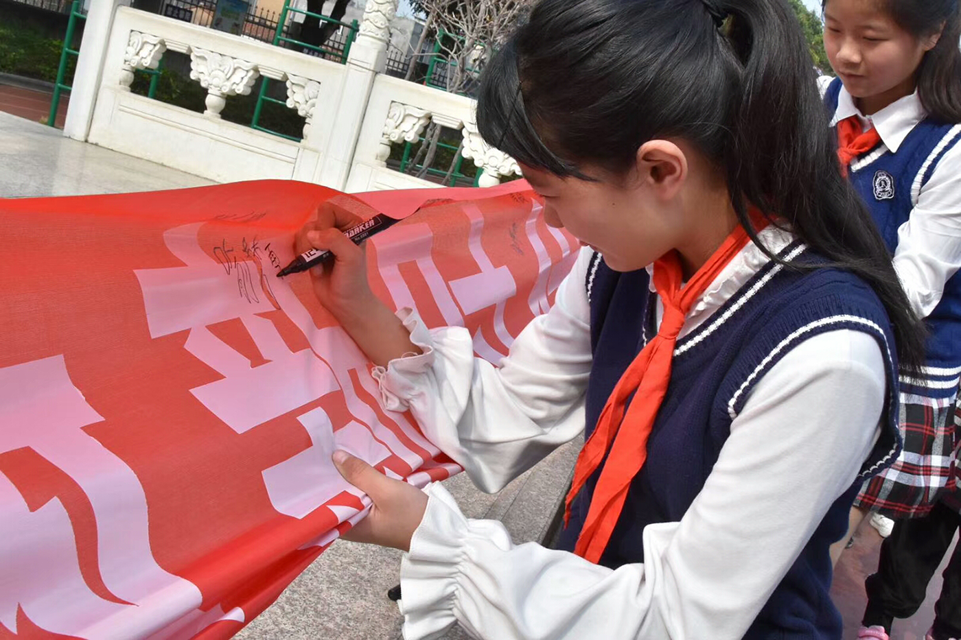 教师党员志愿者、各班同学代表一同上台签名,郑重写下自己的名字,让全体师生一起努力“践行雷锋精神 弘扬文明新风”!