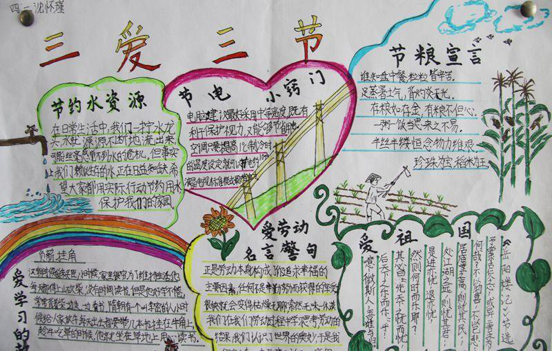 学校利用国旗下讲话,举行“三爱三节”教育活动启动仪式,进行了相关动员部署。各班教师结合主题,深入挖掘语文、思想品德等教材内容,多方收集资料,用生动的事例分层次地对学生进行教育,通过讲故事、学习名人名言等形式引导学生认识“三爱三节”的重要意义。此外,各中队开展了形式多样的队会活动,并通过手抄报、黑板报评比活动,让学生用手中的笔描绘对“三爱三节”的理解。