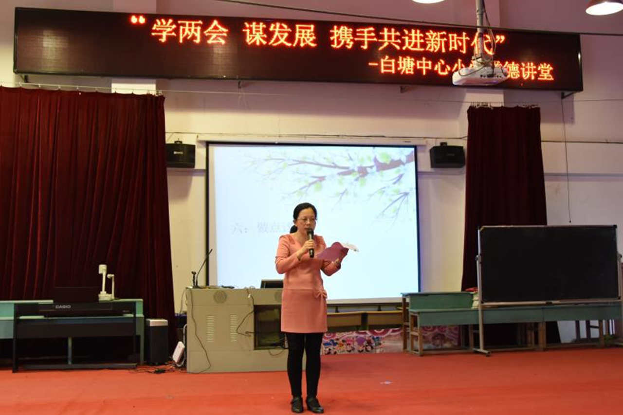 4月11日下午,涵江区白塘中心小学2018年首期道德讲堂围绕“学两会、谋发展,携手共进新时代”为主题展开活动。