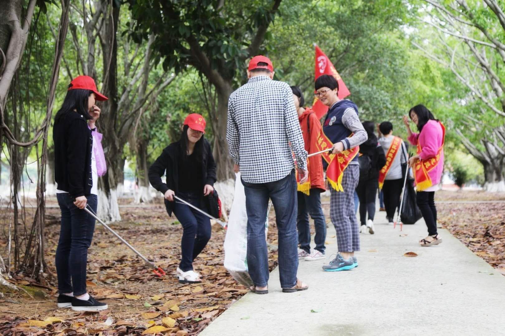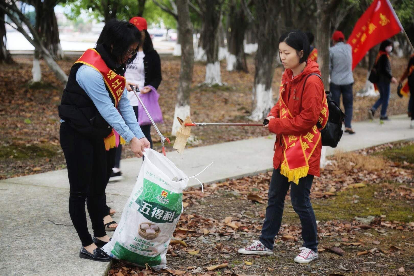 20名志愿者分为3小分队对白塘湖岸线和公园内桃花林绿色步道周边进行垃圾清理,志愿者一只手紧提垃圾袋,另一只手捡拾白色垃圾。在捡拾垃圾过程中,志愿者们也不忘给周边群众进行环保宣传,吸引了许多热心群众主动加入。20余名志愿者经过2个多小时的努力,共捡拾白色垃圾近20袋。