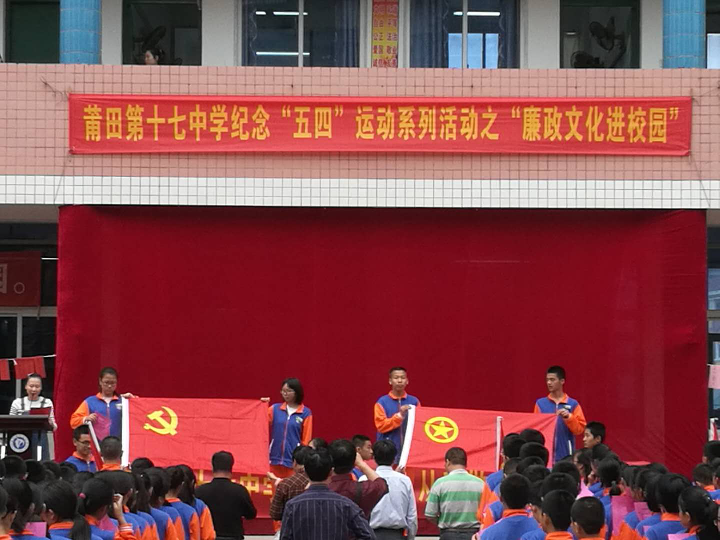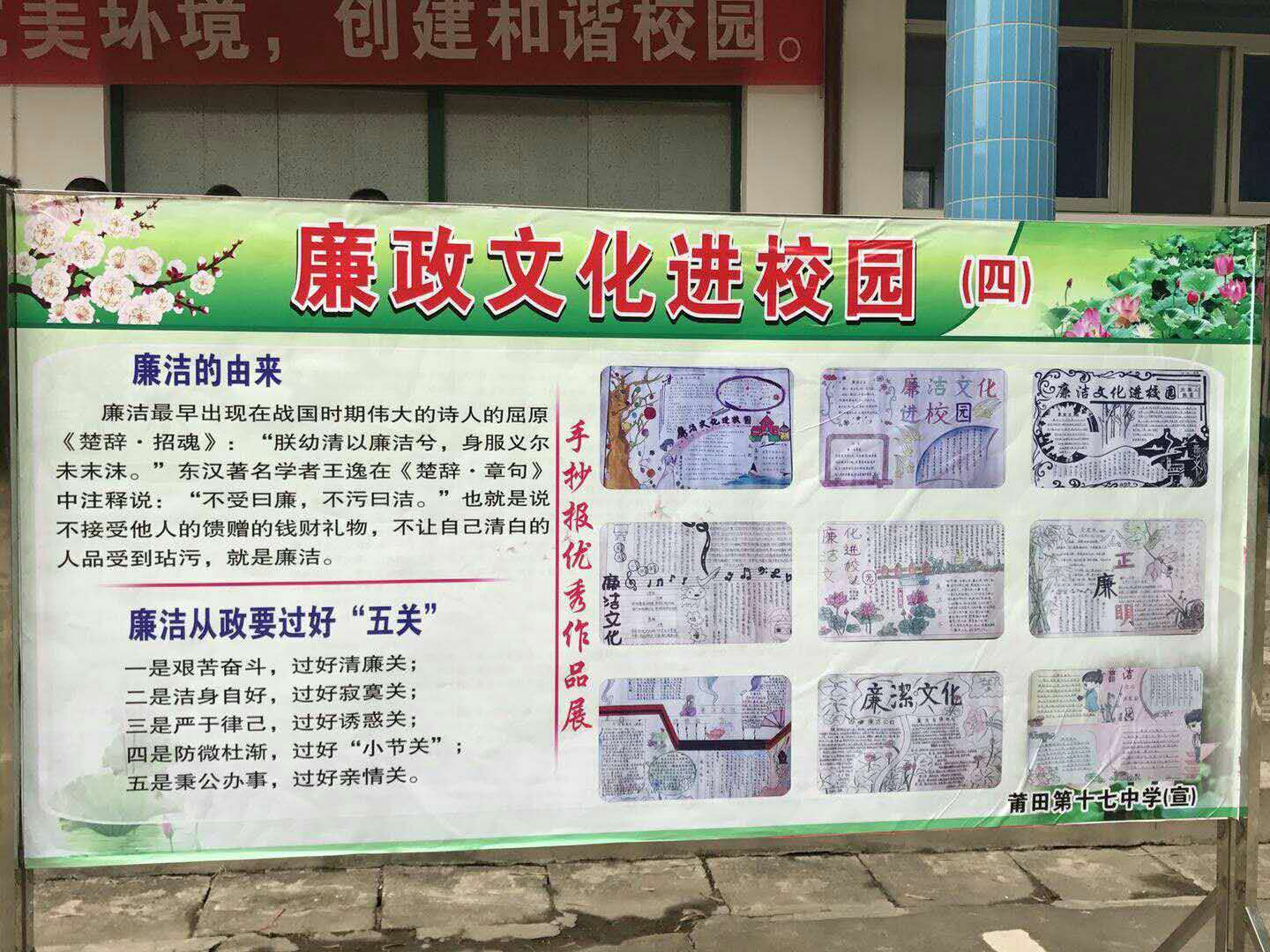 一幅幅廉政格言书法,一张张廉政手抄报,一场场廉政主题活动……为加强校园廉政文化建设,倡导广大师生形成廉洁自律的校园文化氛围,进一步推进党风廉政建设,构建和谐文明校园,5月3日,莆田第十七中学开展了“廉政文化进校园”系列活动。