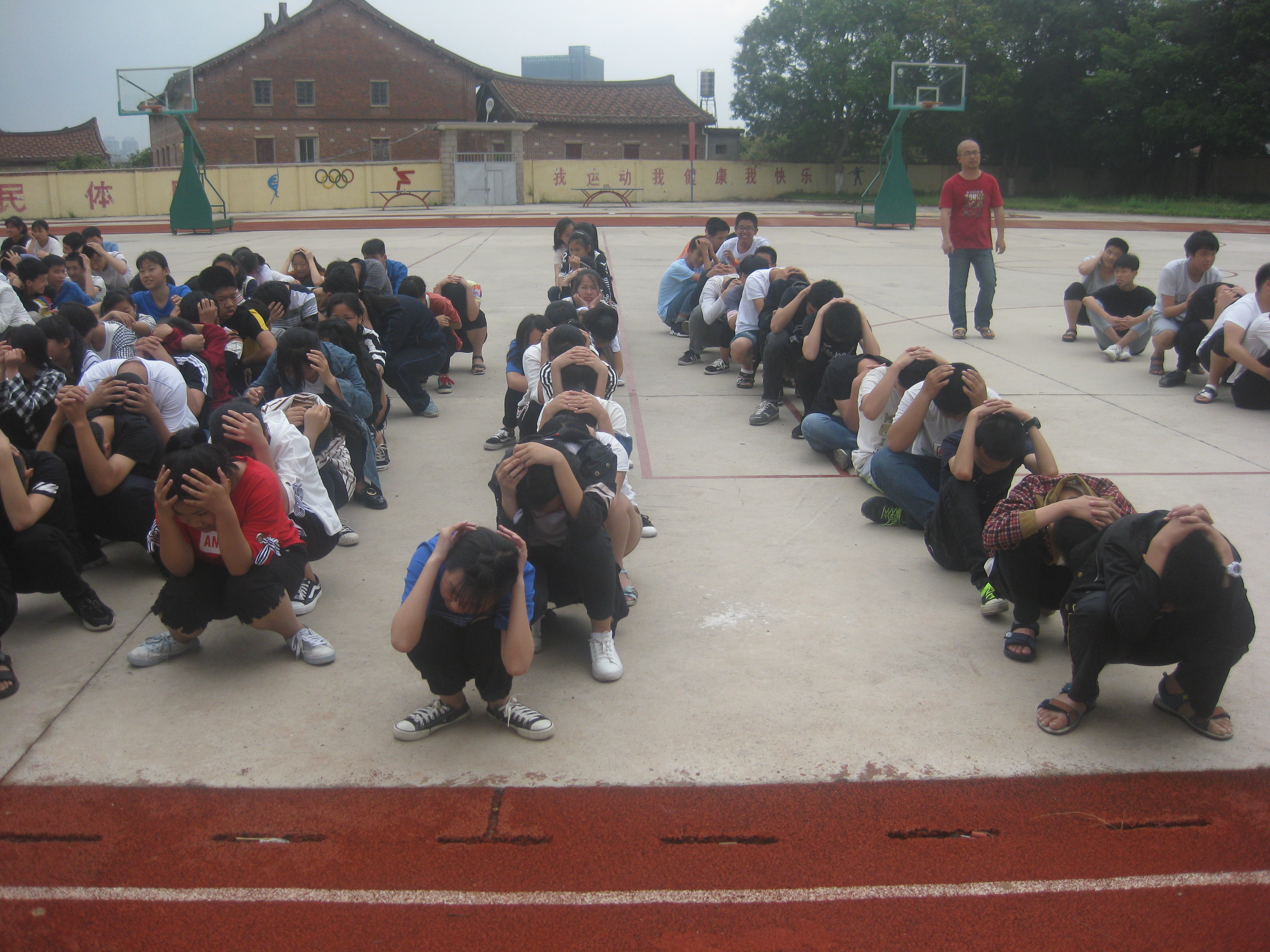 5月7日上午课间操期间,涵江华侨中学举行防震疏散演练,初中部、小学部所有师生参加。听到警报声后,各班班主任组织学生紧急避震(迅速抱头、闭眼、躲在各自的课桌下或课桌旁),随后各楼梯负责人和上课教师在指定位置组织学生进行疏散,短短的2分钟内,所有师生安全疏散到大操场。安保处主任对防震疏散演练进行点评,分管安全副校长作防灾减灾周讲话,从而拉开了今年“防灾减灾”宣传周活动的序幕。