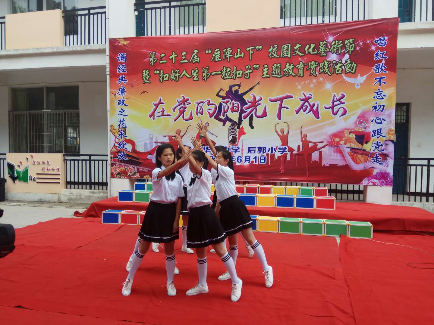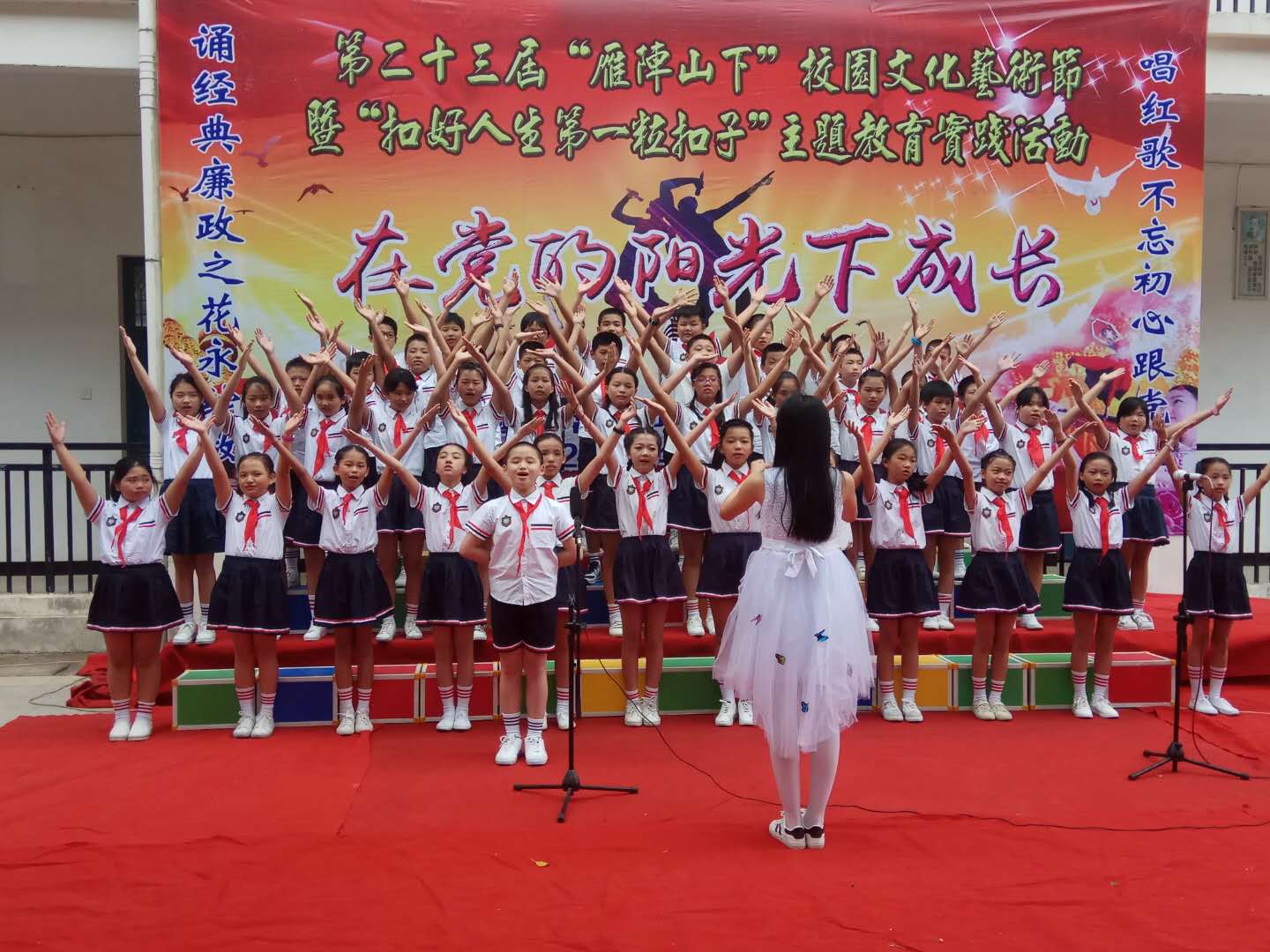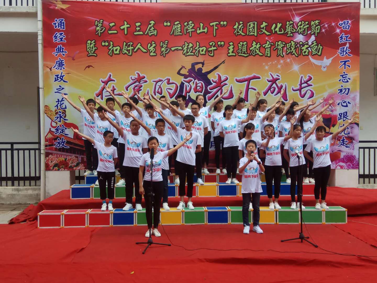 本届校园文化艺术节从5月初开始,历时一个月,紧紧结合“扣好人生第一粒扣子”主题教育实践活动,突出唱红歌、诵经典,引导广大农村学生不忘初心永远跟党走,让廉政之花在校园里永远绽放。汇报演出节目形式多样、丰富精彩,有《沁园春·雪》、《三字经》等集体诵读;《渔舟唱晚》、《红梅赞》等古筝、二胡演奏;《黄河颂》、《校园的早晨》等红歌合唱;还有单人、四人舞蹈以及手语、小品等表演。