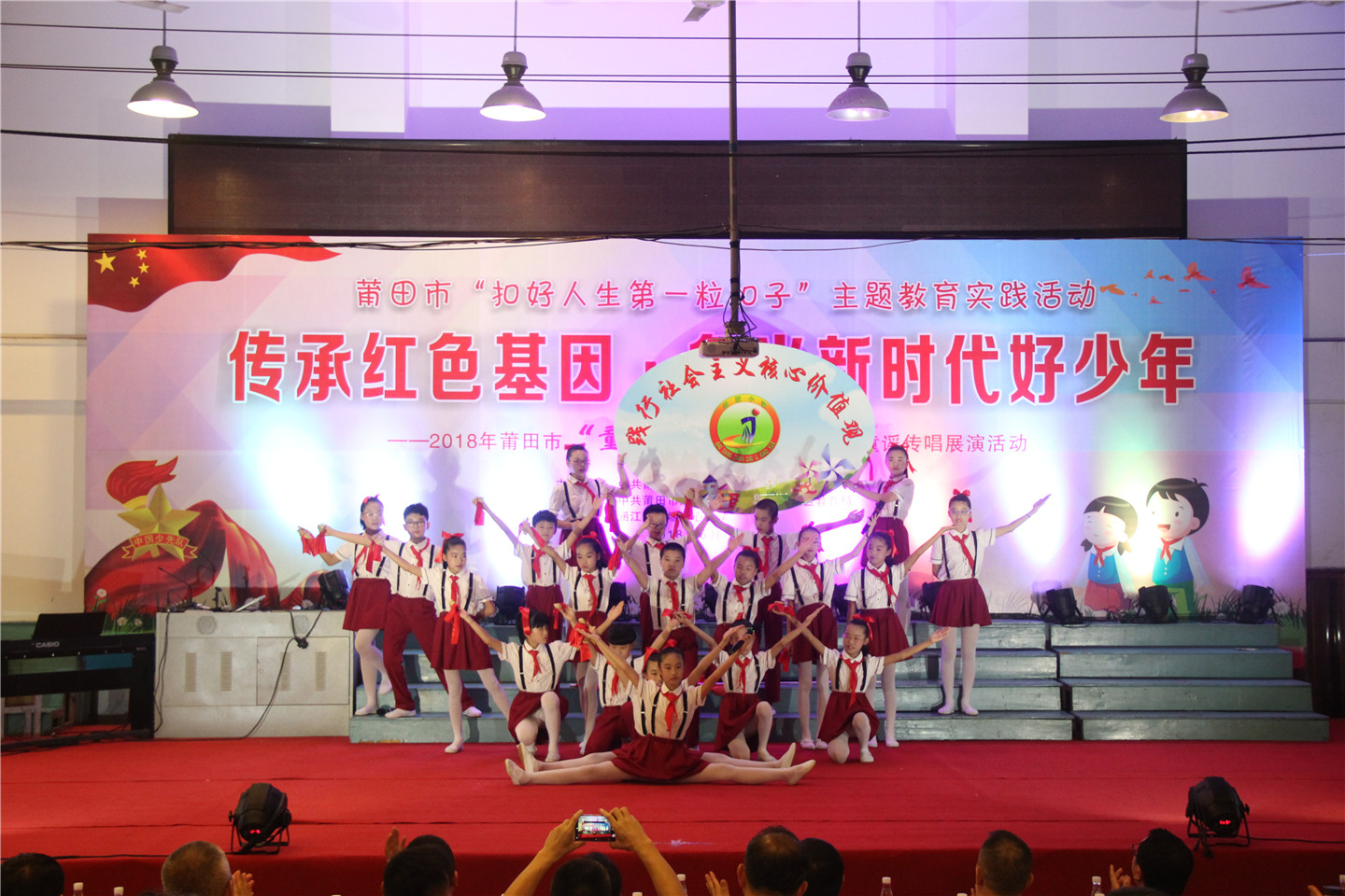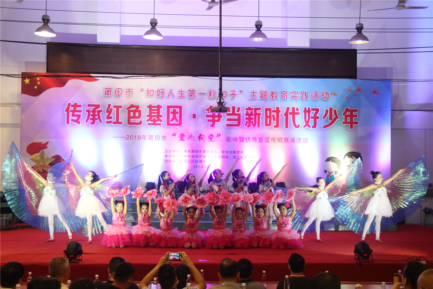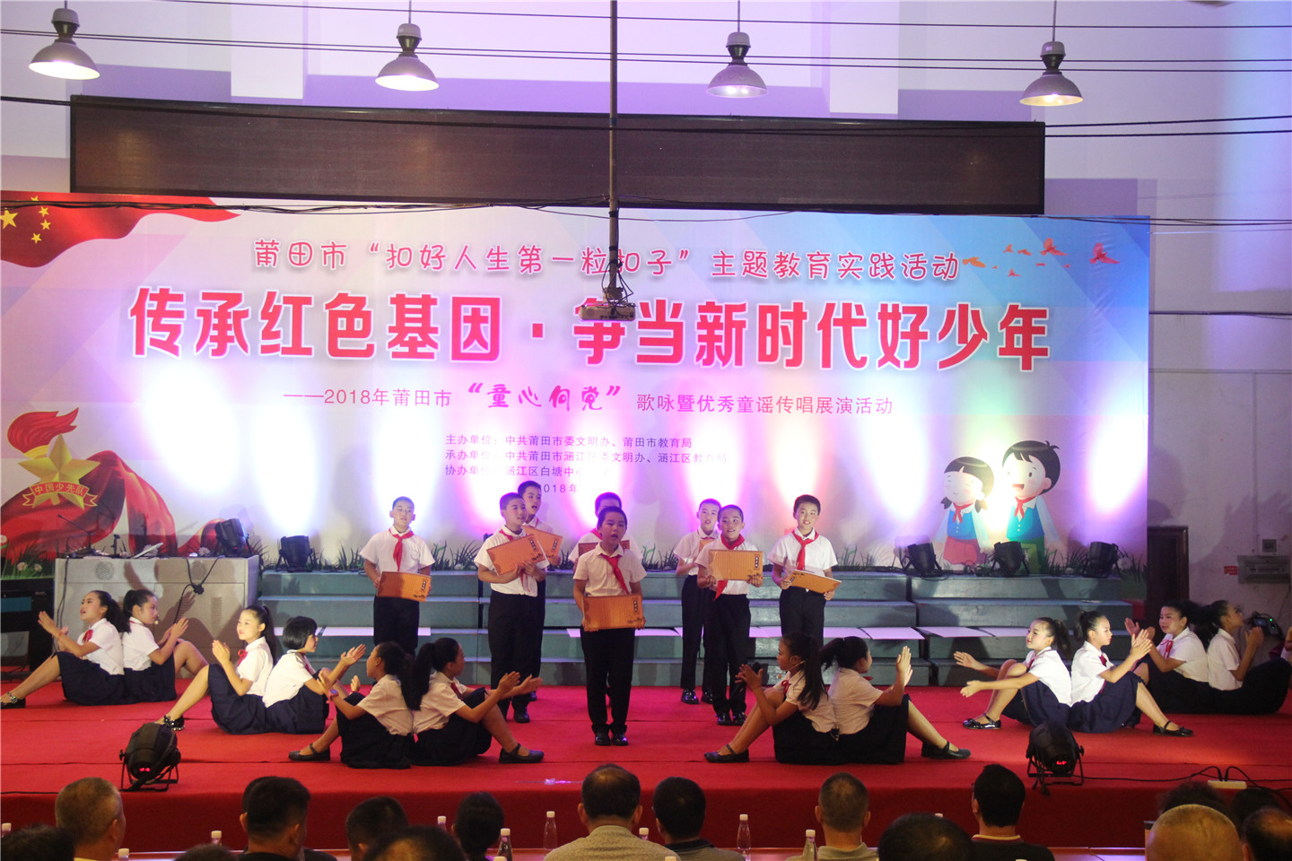 随着一首激昂的合唱曲《中国少年先锋队队歌》响起,2018年莆田市“童心向党”歌咏暨优秀童谣传唱展演活动正式拉开序幕。随后,由学生精心准备的《红领巾心向共产党》《中国版图》《中国梦·梦之复兴》《娃娃的中国梦》《美好家园齐创建》等优秀歌曲和童谣轮番上演,以集体合唱、快板唱、歌伴舞等多种表演形式,既宣传中国梦、社会主义核心价值观等内容,又唱出他们对祖国的热爱,以及自己心中对党、对梦想、对中国梦的渴望和追求,同时呼吁广大未成年人从小树立为实现中华民族伟大复兴的中国梦而努力奋斗的决心。