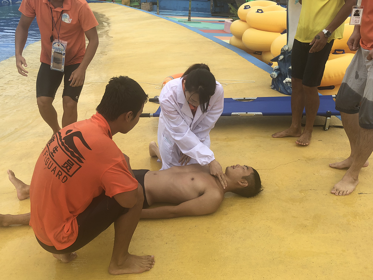 上午九点,演练正式开始。在泳池,演示一名游客不慎溺水,救生员等人发现后赶紧前去营救,被救起时,人已经处于休克昏迷状态,医务人员及时赶到进行人工呼吸和心肺复苏,并送往医疗机构进行救护。
