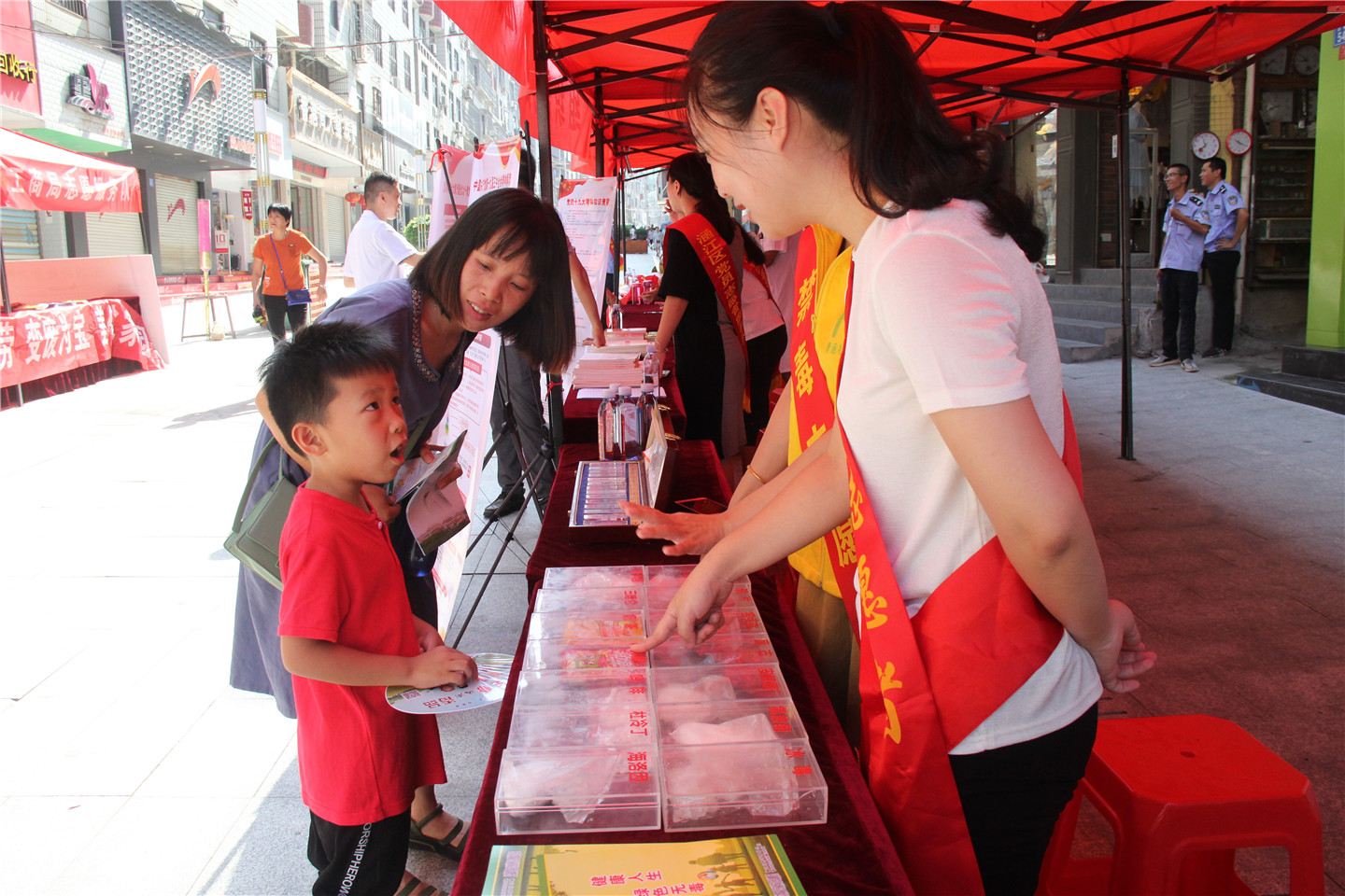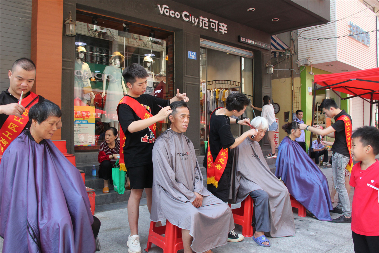 上午8点半,数十名党员志愿者在顶铺步行街摆起服务摊位,为群众提供政策咨询、健康宣传、义务诊病、义务理发等免费服务。其中最受欢迎的是来自涵江区工商局的义务理发摊位,来往的行人纷纷排起队伍,等待理发。禁毒大队志愿服务队前也聚集了很多群众,工作人员利用仿真样品向大人和孩子们介绍新型毒品,提高他们的识毒、防毒能力。
