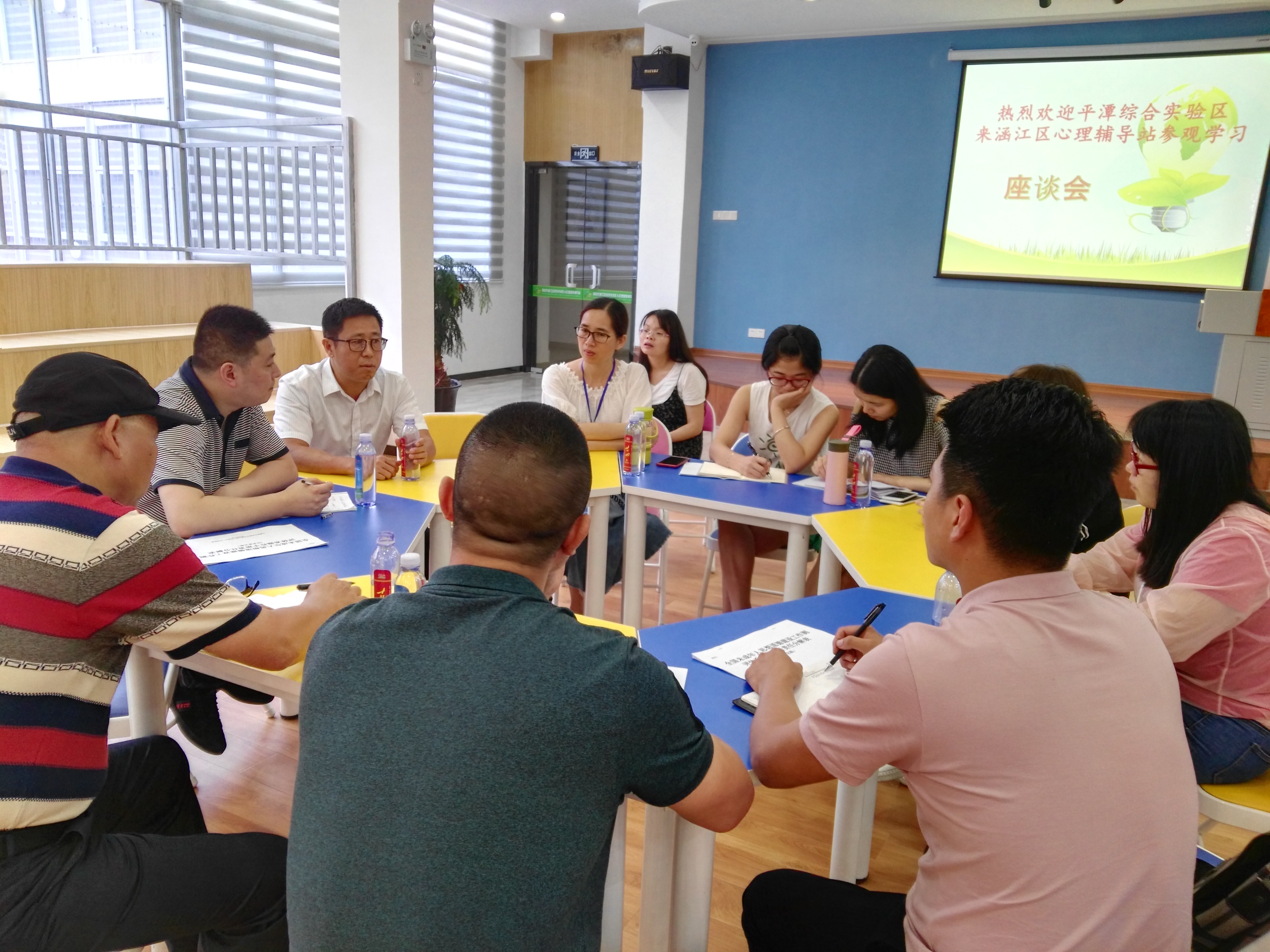 考察团在工作人员的带领下,首先来到各个功能室,参观了解功能室的仪器作用、操作流程、管理制度并亲自体验。接着,在团体活动室举行座谈会。工作人员以PPT 的形式从辅导站的建设发展、育心团队、志愿服务等六个方面向考察团成员形象直观地介绍辅导站的工作开展情况。考察团对辅导站举行的丰富多彩的活动给予极大的赞许。