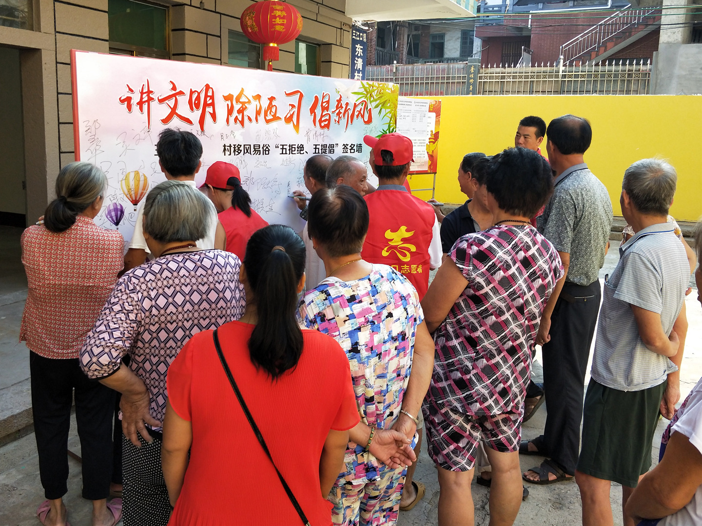 活动现场,工作人员通过悬挂横幅标语、张贴海报、设立展板等多种形式进行宣传,吸引了众多村民前来围观。志愿者们还宣读了移风易俗及扫黑除恶倡议书,通过通俗易懂的图文展板为过往群众讲解破旧立新、丧事简办、婚事新办、厚养薄葬等移风易俗方面的知识,也向大家普及了扫黑除恶、河道整治、“两违”等方面的知识。此举得到广大群众的热情响应与广泛支持,大家纷纷在移风易俗“五拒绝、五提倡”签名墙上郑重签名以表决心。随后,志愿者们还分批走街串巷、走访入户分发宣传资料,与群众面对面讲解交流,大力宣传移风易俗及扫黑除恶工作。