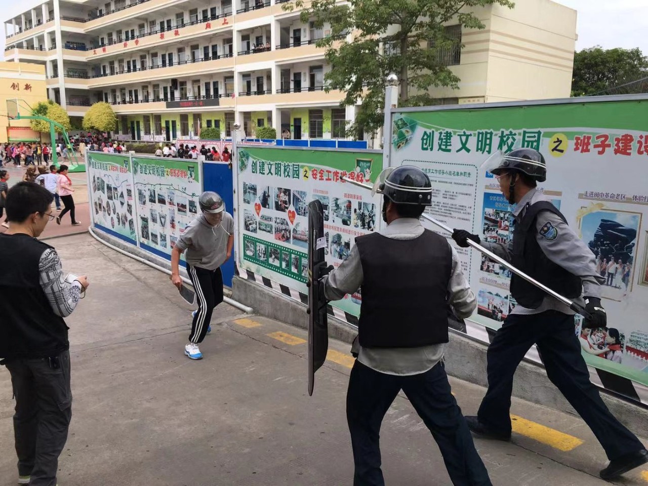 此次演练以处置一名暴恐分子携带刀具翻墙进入校园为模拟场景。校园值班人员发现后,立即拉响警报并报警。接到警报后,校方立即启动反恐防暴应急预案,组织安保人员使用盾牌、抓捕器等防暴器材迅速将该暴恐分子控制。同时,其他教师和工作人员组织学生躲进教室自救。演练过程中,全体人员反应迅速、分工协作,达到了预期的效果。