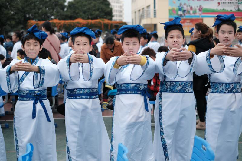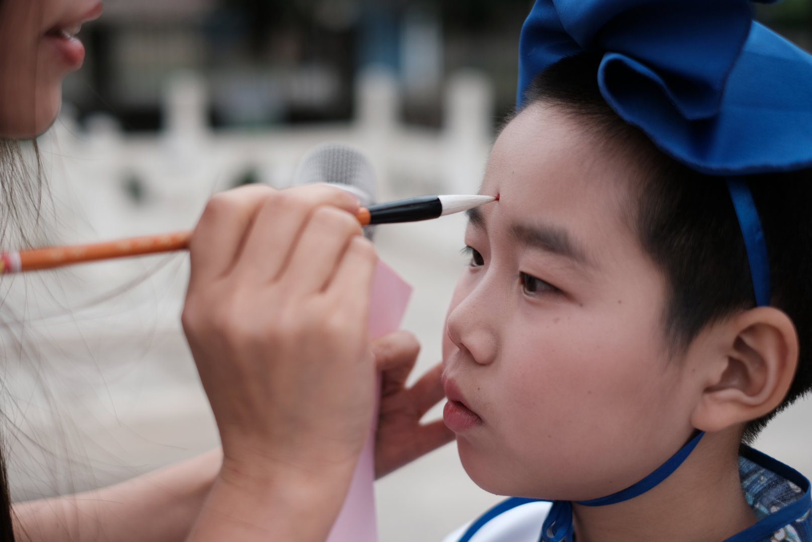 活动现场,学校领导和五年段200多名学生家长,共同见证这一幸福时刻。在“朱砂启智”环节,老师手持蘸着朱砂的毛笔,在学生眉心处点上一个像“痣”的红点。因“痣”与“智”谐音,意为开启智慧,目明心亮,希望学生日后的学习能一点就通。随后进行“师拜孔子”。面对父母、老师和朋友,学生们面对孔子进行三鞠躬,行三个庄重的成长礼。最后,全体学生诵读经典古文《孝经》选段,感谢父母的养育之恩。