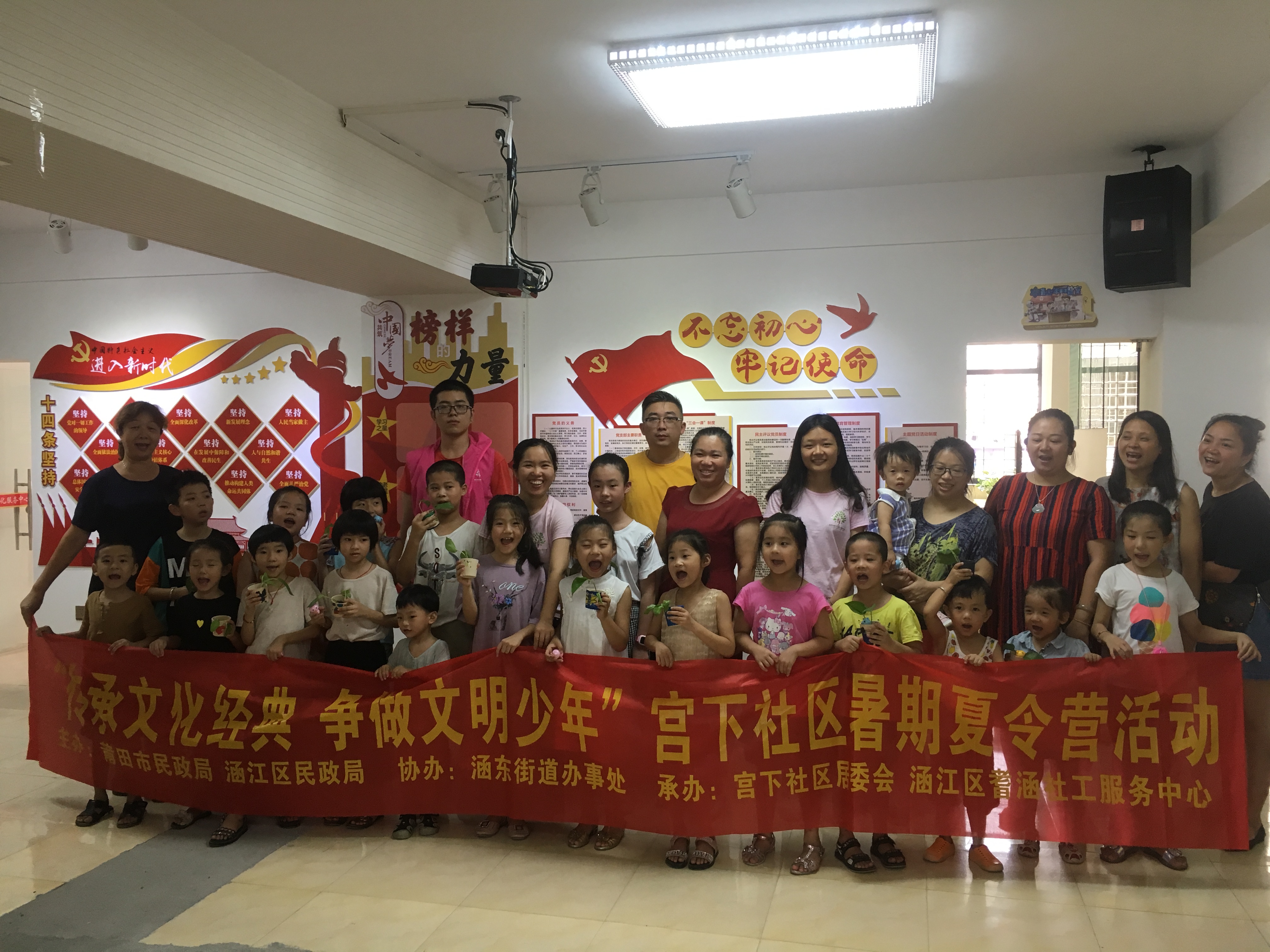 为进一步推进社区文化建设,近日,由莆田市民政局、涵江区民政局主办,涵东街道办事处协办,宫下社区居委会、莆田市涵江区耆涵社工服务中心承办的三社联动“传承文化经典,争做文明少年”夏令营活动在宫下社区开展。