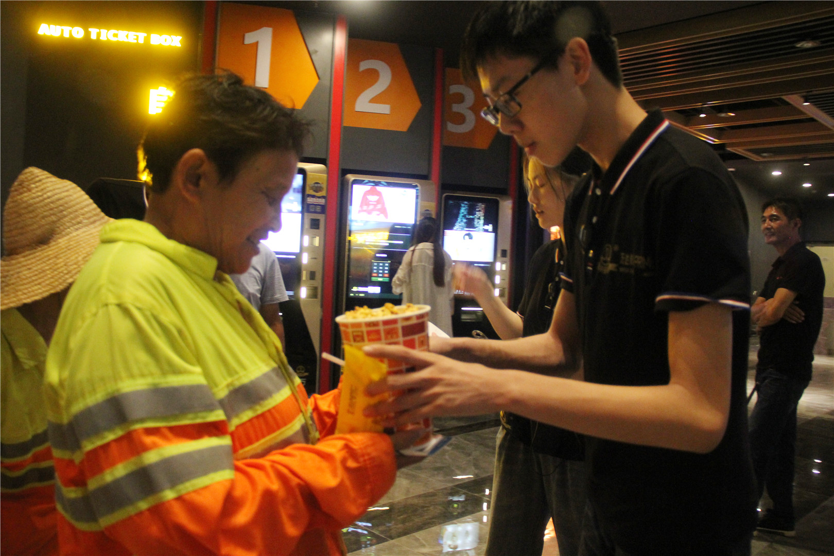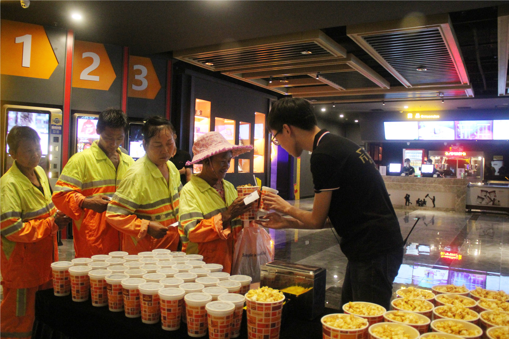 当天下午四点,环卫工人来到电影院,观看电影《烈火英雄》。影片开始前,影院志愿者热情地为环卫工人分发爆米花和可乐,并引导环卫工人有序进场,帮助他们找到指定位置就坐。影院内,环卫工人们一边目不转睛地看着电影,一边开心地吃着爆米花,脸上写满了欣喜与惬意。