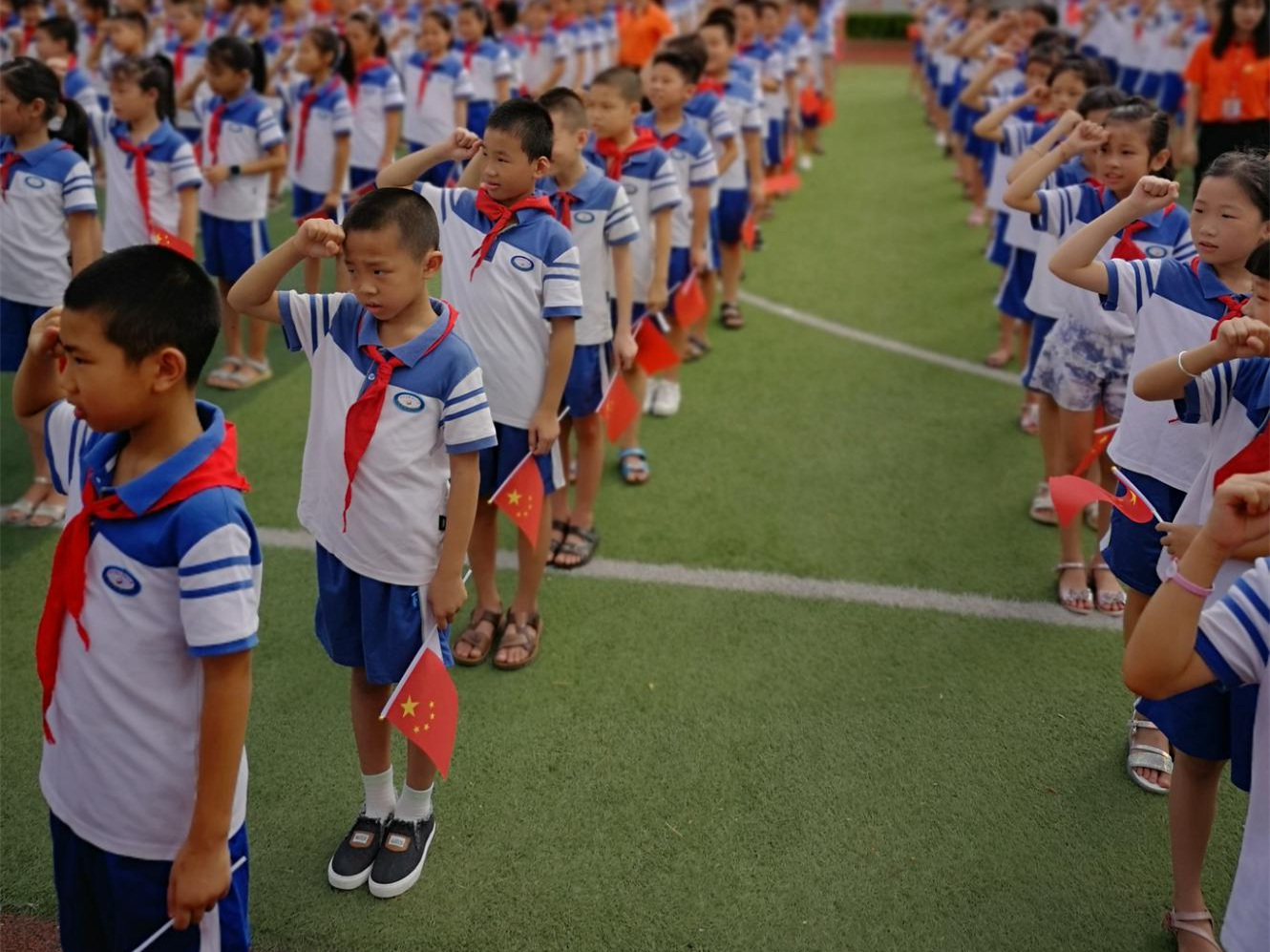活动在欢快的歌声中拉开了序幕。老师们和高年级的红领巾志愿者们抑制不住欣喜,早已列队等候。一年级的新生和家长们携手走过红地毯,开启了他们小学生涯的大门。其他年级的队员们也欢喜雀跃地挥舞着小国旗有序入场。紧接着,在嘹亮的国歌声中,全体师生凝神瞩目,小旗手共同升起国旗。全体少先队员用铿锵有力的誓言——我是祖国的护旗手,向祖国妈妈诠释了爱国理想。