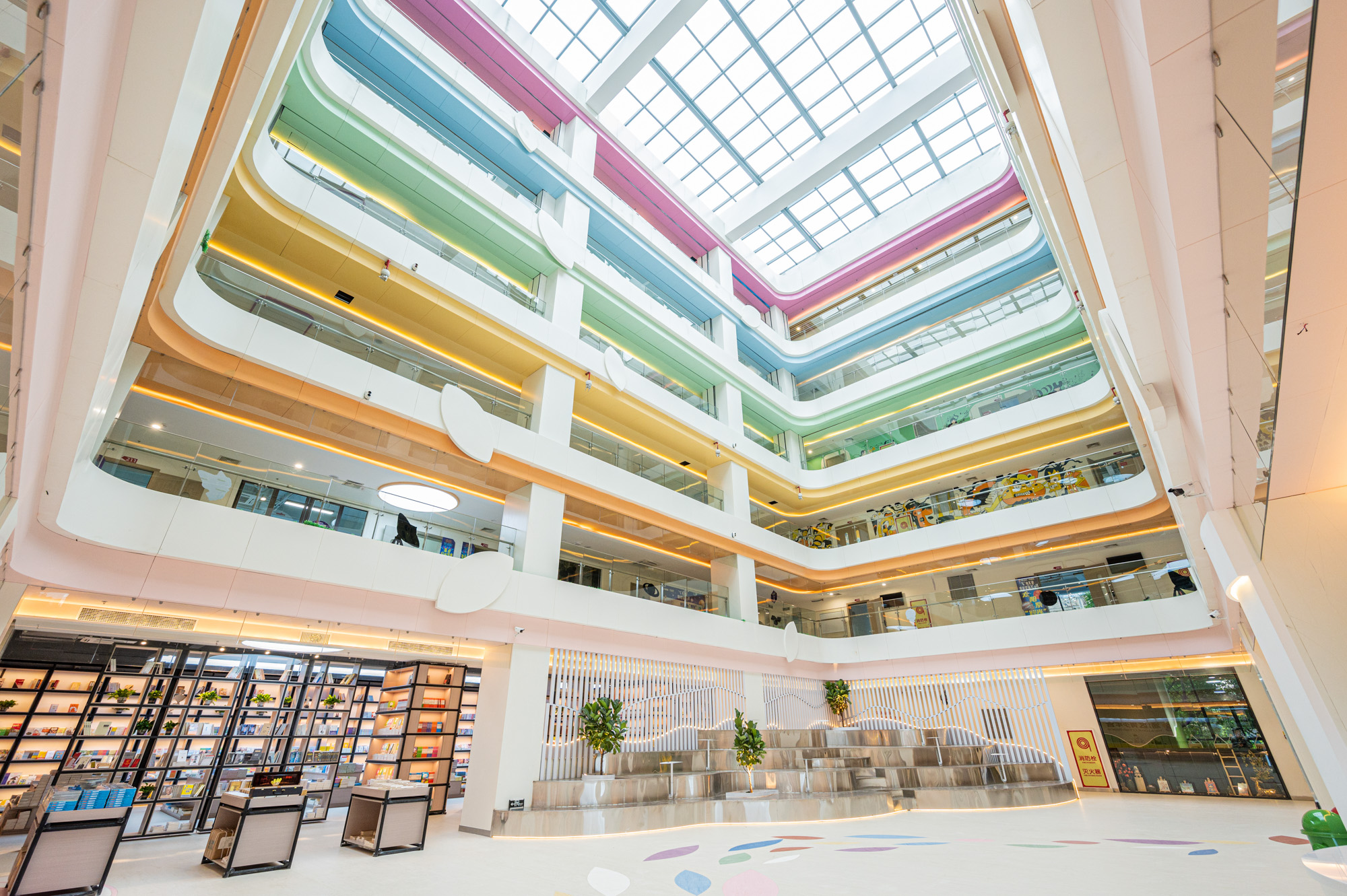 日前,记者来到兴涵水都片区的涵江区青少年宫探访。其外观现代时尚大气,在阳光的照射下十分亮眼。穿过六色大门,一个宽敞高挑的大空间给人一种开阔感。抬头望去,大面积的透光玻璃屋顶使得整个空间更加明亮,6层环形走廊色调虽各不相同,却清新雅致。高规格的布局设计,搭配绿植和暖黄色的灯光,增添了几分温馨舒适感。