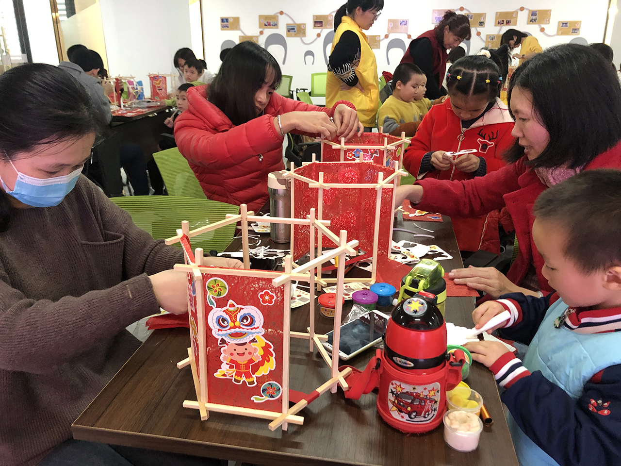 活动伊始,莆田市阳光青少年事务服务中心的社工们带领亲子家庭一起进行热身游戏“抓逃手指”,紧张刺激的游戏节奏让大朋友和小朋友惊叫声连连,欢笑满堂,充分调动了亲子家庭参与活动的积极性,也活跃了现场气氛。随后,社工利用视频、ppt课件带领亲子家庭一起放眼世界,学习各地过元旦不同的习俗,让现场的小朋友分享自己家的过元旦方式;活动现场社工们还准备了有趣的猜灯谜环节,大家纷纷摩拳擦掌,“脑洞大开”争先举手,竞猜声此起彼伏,再一次将活动气氛推向了高潮;动动脑过后,就是动动手环节了,社工们为每一个家庭准备了中国传统技艺灯笼的制作材料,家长和小朋友互相配合、共同研究搭造灯笼骨架、拼贴灯笼“外衣”,展现出了一幅和谐、甜蜜的幸福画面。