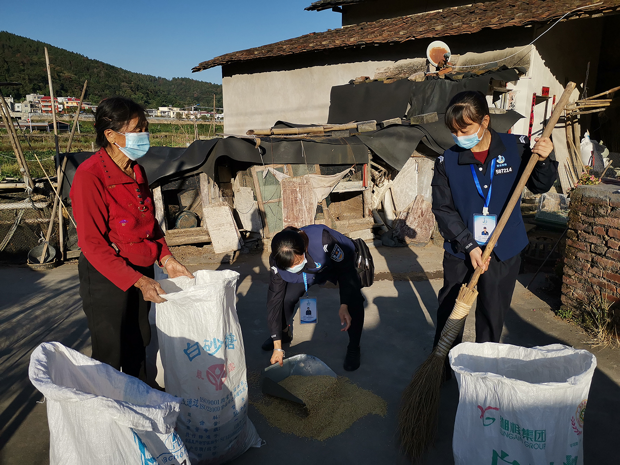 家住白沙镇长兴村的陈秀林老人今年79岁高龄,身边除了一名患病的儿子,其他子女均在外务工。入秋以来,家里几亩田里的稻谷急需收割、晾晒,连续的劳作让老人有些吃不消。得知情况后,网格员戴丽君、陈素华和郑彬主动来到了老人家里帮忙晾晒、翻转、装袋、搬运……看着三名网格员娴熟的动作和一袋袋收好的谷子,老人的心里不禁感觉到一阵阵的暖意。